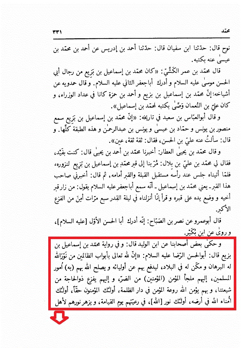 روى محمد بن إسماعيل بن بزيع قال : أبو الحسن الرضا عليه السلام : « إن لله تعالى بأبواب الظالمين من نور الله له البرهان ومكن له في البلاد ، ليدفع بهم عن أوليائه ويصلح الله بهم ( به ) أمور المسلمين ، إليهم ملجأ المؤمن ( المؤمنين ) من الضر ، وإليهم يفزع ذو الحاجة من شيعتنا ، وبهم يؤمن الله روعة المؤمن في دار الظلمة ، أولئك المؤمنون حقا ، أولئك أمناء الله في أرضه ، أولئك نور [ الله ] ، في رعيتهم يوم القيامة ، ويزهر نورهم لاهل السموات كما يزهر الكواكب الدرية لاهل الارض ، أولئك من نورهم نور القيامة ، يضئ منهم القيامة ، خلقوا والله للجنة وخلقت الجنة لهم ، فهنيئا لهم ، ما على أحدكم أن لو شاء لنال هذا كله.