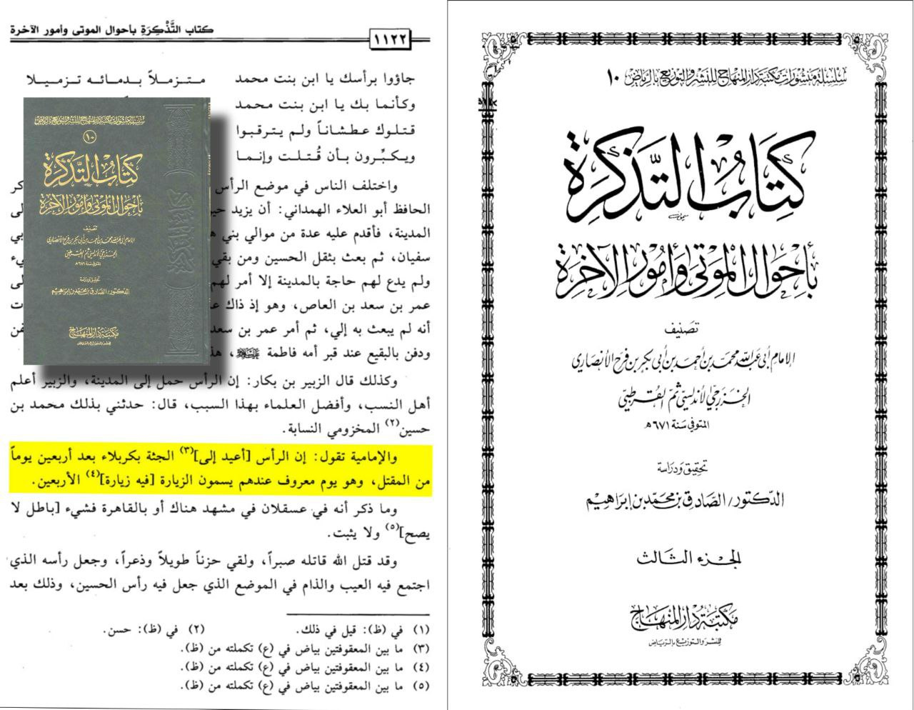 التذکرة باحوال الموتی و امور الآخرة، تالیف قرطبی، صفحه ۱۱۲۲، چاپ مکتبة دار المنهاج (تصویر الحاقی)